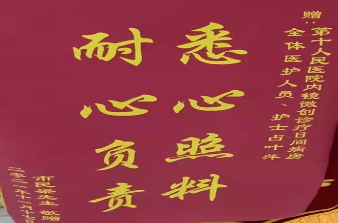 今年11月中旬,在上海第十人民医院消化二区实习的占叶萍同学,对待工作一丝不苟,在服务某患者时,耐心细致向患者及其家属交代了术后饮食、运动、药物方面等的注意事项,在患者住院期间悉心照料,让患者感动在心,患者出院后,患者家属前来医院当面给她送上了“悉心照料,耐心负责”锦旗。