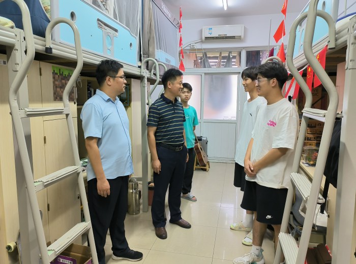 9月1日学生陆续返校后,足球竞彩 领导带领足球竞彩 学工队伍第一时间走访学生宿舍,看望慰问返校学子,详细了解同学们的暑期情况、学习成果、实践动态,针对同学们反映的实际困难提出切实可行的解决方案,并勉励大家在新学期以崭新的面貌、满腔的热情、拼搏的心态迎接新挑战,笑对新征程。